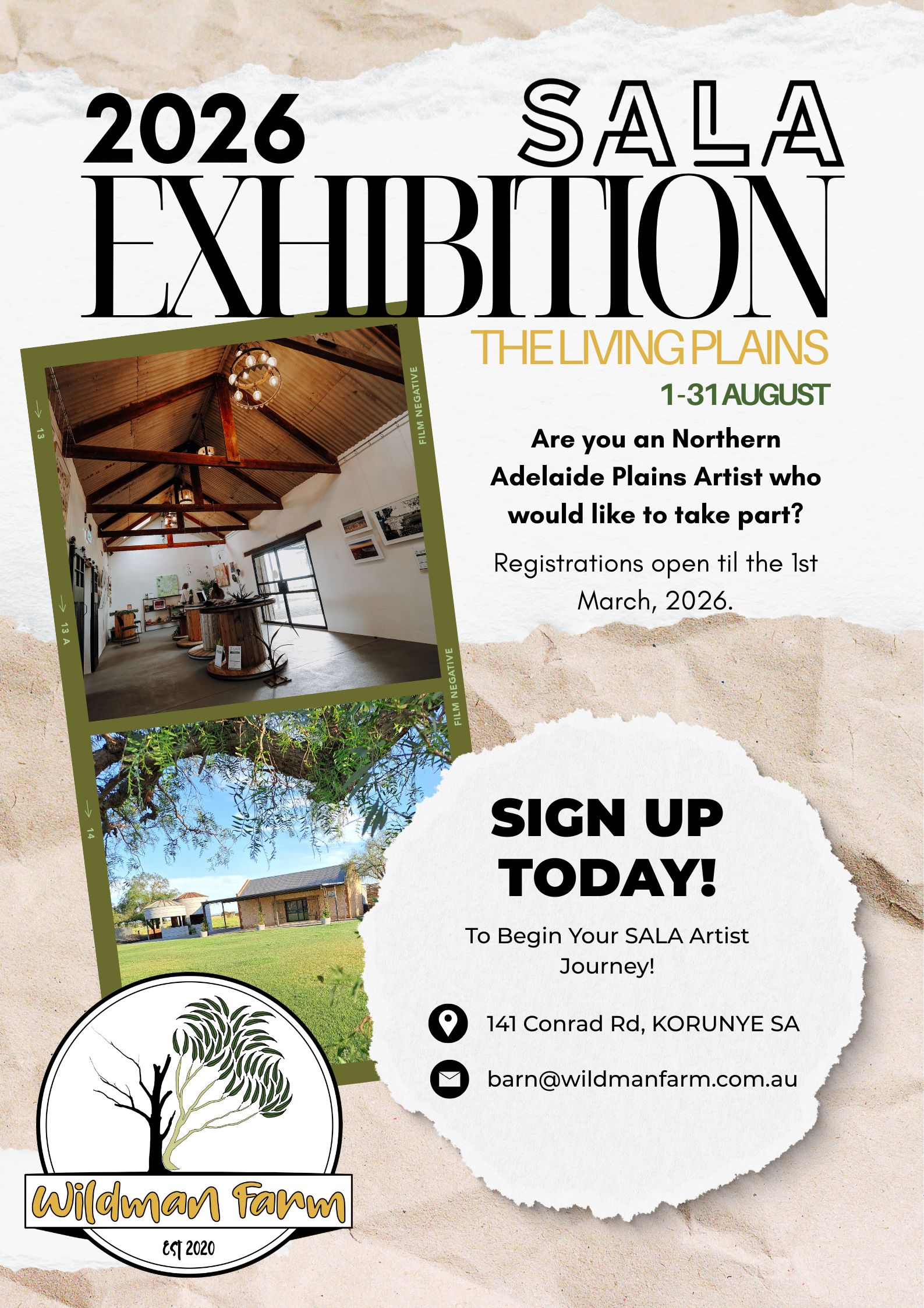 Wildman Farm SALA 2026: Calling Adelaide Plains Artists Theme: The Living Plains Wildman Farm is proud to return as a SALA Festival venue in August 2026, and we’re inviting artists from across the Adelaide Plains to be part of this year’s exhibition. The Living Plains celebrates the land we live and work on, its seasons, stories, textures, resilience, and quiet beauty. From cultivated paddocks and native flora to rural life, memory, movement, and change, we invite artists to interpret what the plains mean to them. 🌾 Who can apply? 🖌️ About the space 📅 Expressions of Interest close: 1st March 2026