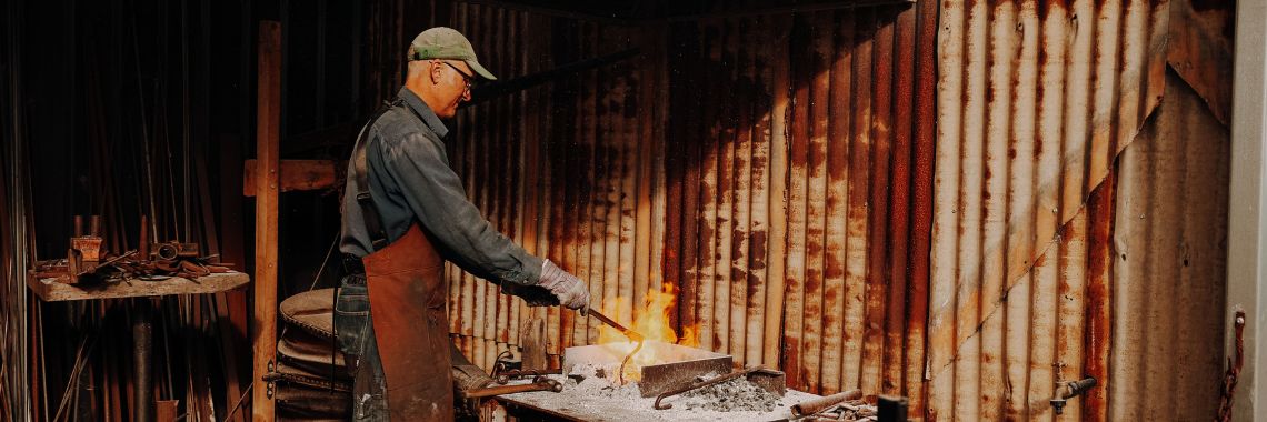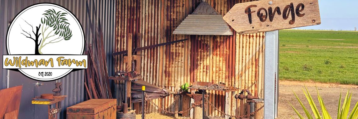At Wildman Farm, we proudly feature a classic Coke forge, originally from a Seppeltsfield farm and equipped with an old leather-bound air bellows from a century-old forge in southern Adelaide. This setup is complemented by recycled beams from within the barn.